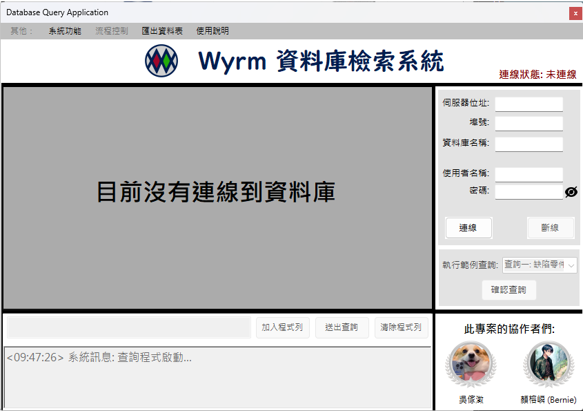 Wyrm-DB GUI 是一個專為 MariaDB 資料庫查詢與管理設計的 Windows Form 應用程式,旨在為汽車公司資料庫系統提供直觀、易用的圖形化操作介面。本專案作為資料庫期末專案(DB_FinalProject)的延伸,將複雜的 SQL 查詢語句轉化為視覺化的使用者體驗,讓使用者無需深入了解 SQL 語法即可進行資料庫連線、查詢執行與結果匯出等操作。
